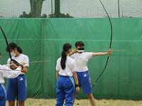 1年生の保健体育の授業のようすです。現在弓道を行っており,弓道部の生徒がていねいに他の生徒に教えています。