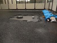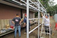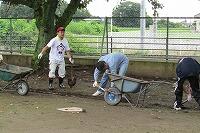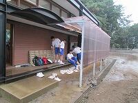 今回は、校庭東側に水たまりができてしまうので、水はけをよくするために側溝を作っていただきました。さらに、弓道場北側にひさしを作っていただきました。
