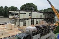 プレハブ校舎がほとんど完成しましたので、見学してきました。室内は明るくとてもきれいでした。ただ、今日は気温が高かったためか2階南側はとても暑く感じられました。でも、教室にはエアコンが設置されていますので安心です。引っ越しは11月の予定です。