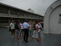 養護教諭の渡辺先生の説明を中心に、校舎南側のアサガオや