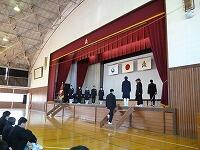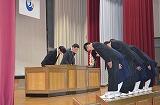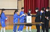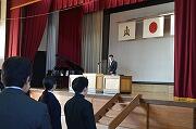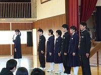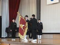 前生徒会長の亀山さんから生徒会長の関口君に校旗が渡されました。その後、前生徒会役員は1年間の活動を振り返りました。