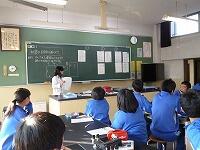 職員の方々は、給食の始まりや、給食で使われている地元食材などのお話をしてくださいました。