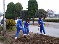 緑化委員会の皆さんは、校舎の南花壇を耕していました。