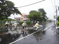 朝から雨が降り、生徒の登校は大変です。ほとんどの生徒は、カッパを着て、ルールを守り登校しています。ただ、カッパを着ない生徒や交差点でしっかり一時停止をしない生徒もいますので、改善して欲しいと思います。