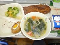 ココア揚げパン、牛乳、スコッチエッグ、ケチャップ、ブロッコリーサラダ、エビボールスープ です。