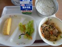 ご飯、牛乳、ひきずり(鶏肉のすき焼き)、卵焼き、キャベツの浅漬け です。