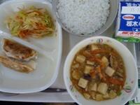 ご飯、牛乳、麻婆豆腐、蒸し餃子、中華和え です。
