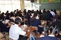 今年のテーマは「進路」。ブックトークに集まった生徒は、3年生はもちろんのこと、1、2年生もみんな興味津々です!