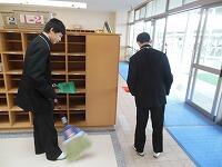 剣道部がボランティアとして,昇降口周辺の掃除と靴をそろえて靴箱に置くように呼びかけました。