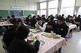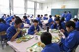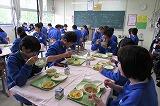 給食はみな段取りを覚えたため、四時間目終了から給食までの流れがスムーズになってきました。クラス間で配膳の早さを競っているのも手際のよさの向上に一役かっていると思います。また、待っている生徒達も自分の席についてグループのみんなと談笑しています。