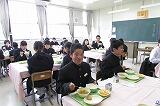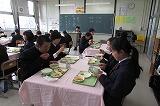 生徒の皆さんの大好きな給食メニューはカレーです。新しいクラスでも和やかな雰囲気で会食していました。