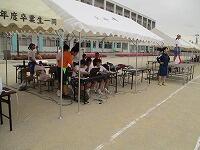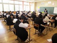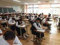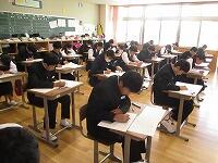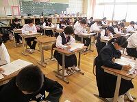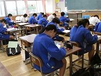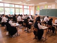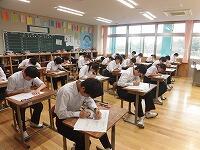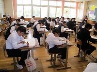 期末テストが始まりました。今年度は修学旅行の日程の都合で,今週は3年生,来週は1,2年生が期末テストを行います。3年生は問題を一生懸命解いていました。