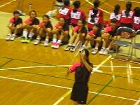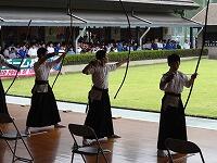 1年生女子の保健体育の授業のようすです。弓道を行っています。初めての生徒が多く,通常より前から的に向かって矢を放っています。