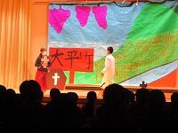 本日のけやき祭の演劇のようすです。体育館に大勢が入るのを避けるため,各学年とも1,2組と3,4組に分かれ,2回に分けて鑑賞しました。演じる側も,同じ役をそれぞれの回で別な生徒が演じました。迫真の演技に,みんな見入っていました。タイトルは「ロミオとジュリエット 大平中狂想曲」です。