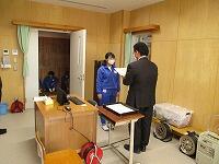 避難訓練を行いました。避難の連絡があってから5分以内に校庭に全員避難し,整列完了しました。また,消防署の方のご指導のもと,水消火器を使い消火体験を行いました。