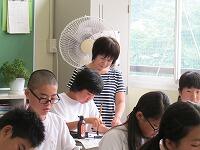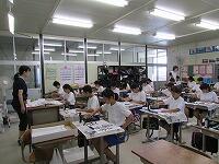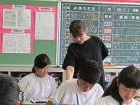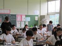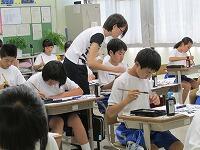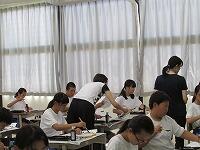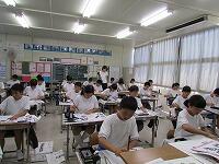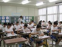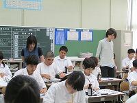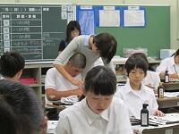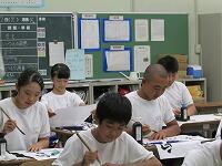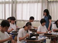 書写の授業に、地域ボランティアの富田さんに指導をしていただきました。1年3組では、生徒たちは静かに姿勢よく書いていました。
