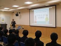 1年生を対象にNTTドコモ様から講師を招いて,「スマホ・ケータイ安全教室」を開催しました。SNSとの正しいつきあい方やライン等の文字だけで気持ちを伝える時に気をつけることなどについての話がありました。映像を交え,わかりやすく話を進めていただきました。