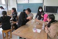 試験管と水を使用して、民族楽器のサンポーニャの様に試験管の口に唇を軽くあて息を吹きかけて音を鳴らしていました。水の量を調節しながら何度も息を吹きかけるので、大変そうな児童もいましたが楽しそうでした。
