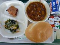 バターロール、みかんジャム、牛乳、照り焼きチキン、海藻サラダ、ビーフシチュー、セレクトケーキ です。