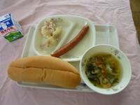 コッペパン、牛乳、ウィンナー、ケチャップ・マスタード、ジャーマンポテト、野菜スープ です。