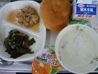 米粉パン、牛乳、豚肉のアップルソース、海藻サラダ、コーンポタージュ、蜜柑のジュレ です。