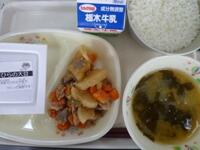 ご飯、牛乳、納豆、大根と豚肉の煮込み、ジャガイモの味噌汁 です。