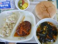 丸パン、牛乳、ハンバーグトマトソース、ジャガイモのチーズ煮、わかめスープ、フルーツカップ です。