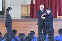 1年生の授業に多く出ていた増田先生ですが、書道の先生ですので生徒たちが勝ち取った賞状に名前を書いていたりお世話になりました。代表生徒にお手紙と花束を受け取った増田先生は、「綺麗な花束とお手紙をありがとうございました。」と感激していました。