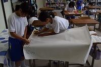 本日の昼休みの1年生の様子。6月26日(金)の校外学習に向けて、調べたことを模造紙にまとめています。仕上げの作業は女子の方が得意なのでしょうか。女子生徒が多いように思われます。