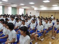 第1学期終業式を行いました。本校では,全生徒が入れる空調設備のある多目的室があり,猛暑の中ですが,涼しい環境で行うことができます。学校長の式辞に続き,各学年の代表の生徒が1学期の反省を発表しました。