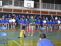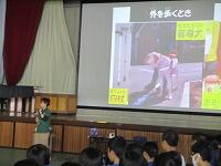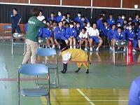 東日本盲導犬協会の方をお招きして,盲導犬体験学習会を開きました。盲導犬の一生や私たちができるサポートについて学習しました。また,アイマスクをつけて盲導犬と一緒に歩く体験をしました。