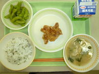 10月3日(月)の給食は、菜飯、牛乳、鶏のから揚げ、“大平産茶豆枝豆”、かんぴょう汁です。