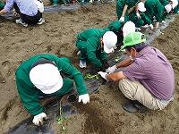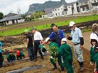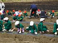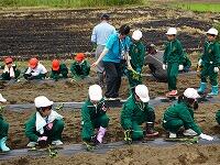 今日は、地域の皆さまにお世話になって、1年生と2年生がさつま芋の苗植えをしました。