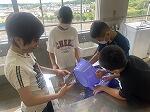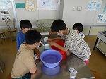 洗濯(手洗い)をするとどのくらい汚れが落ちるのか、「1日前の汚れ」と「直前に付けた汚れ」の時間の経過での比較実験を行いました。汚れは「絵の具」「墨汁」「しょうゆ」「油」「お酢」の5種類で調べました。洗濯をすることで、汚れや匂いが落ちたものもありましたが、きれいに落ちきらなかったものもありました。一番落ちにくかったのは「墨汁」です。また、時間が経過するほど、汚れを落とすことが難しかったようです。子どもたちからは、時間の経過だけでなく、汚れを付けた布の素材や洗剤の種類等でも調べてみたいといった振り返りも出ました!