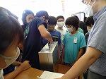 心肺停止状態の人(練習用の人形)が倒れている想定で、心臓マッサージをしながらAEDの到着を待ち、練習用AEDを実際に使うという内容でした。