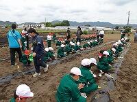 今日は、地域の皆さまにお世話になって、1年生と2年生がさつま芋の苗植えをしました。