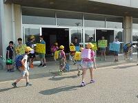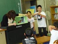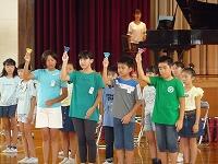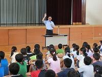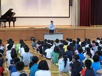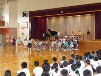 子どもたちは、校長先生のお話を聞きながら、1学期にがんばったことやできるようになったことを振り返りました。また、充実した夏休みを過ごすために、「自分の目標を目指して積極的にチャレンジすること・事故や病気に注意して、規則正しい生活をすること」というお話がありました。その後、2年生と5年生の代表児童が1学期を振り返っての作文発表をしました。最後に、6年生のピアノ伴奏に合わせて校歌を元気に歌いました。式終了後は、児童指導担当から夏休みの生活についての約束事の確認がありました。
