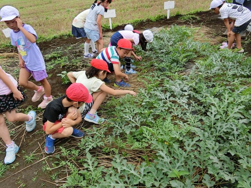ふれあい館の皆さんに教えていただきながら植えた、「すいか」「とうもろこし」「えだまめ」の苗が大きく成長している様子に、子どもたちから歓声があがりました。