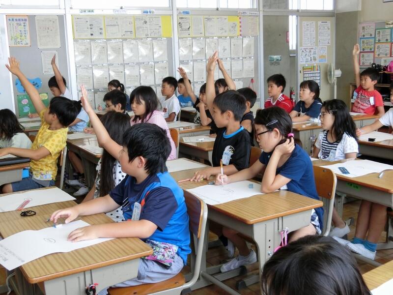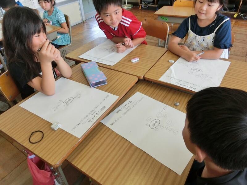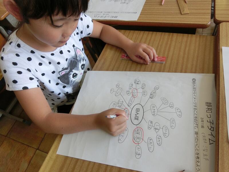 「田んぼ大好き3年生」の学習では、3年生全員で田植えを行い、田んぼの観察を続けています。これまでの活動で学んだことや感じたことをもとに、田んぼに関するイメージを膨らませ、調べ学習のテーマを考えることをねらいとした授業でした。