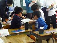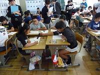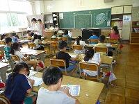 子どもたちは、ふれあい館の方々に自分たちの頑張りを聞いていただこうと、目標を持って一生懸命かけ算九九を覚えました。ボランティアの皆様には、「5・6の段コーナー、・・・ 」のように、それぞれ九九のコーナーを担当していただき、合格した子にはシールを貼ってもらいました。担任一人で行う授業と違って、たくさんのコーナーで次々と合格の段を増やし、すべての児童が1~9のすべての段に合格することができました。中には、各段の九九を3回ずつ合格した児童もいました。ふれあい館の方のやさしい言葉かけに、子どもたちのやる気はいつも以上に高まり、楽しみながら意欲的に学習していました。授業の終わりには、お礼の気持ちを込めて、 「 森のたんけんたい 」の歌を元気に歌いました。ふれあい館の皆様、本当にありがとうございました。