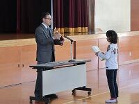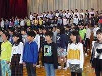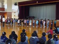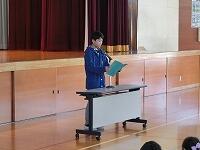 始めに子ども達と「努力・協力・チャレンジの2学期」を振り返りました。大きな行事がたくさんありましたが、その一つ一つを節目として、子どもたちはたくましく成長することができました。その後、3年生と6年生代表児童より、めあてを持って取り組んだ習字や縄跳び、頑張った持久走大会での達成感などについての作文発表がありました。終業式の後は、児童指導の先生による冬休みの生活についてのお話がありました。