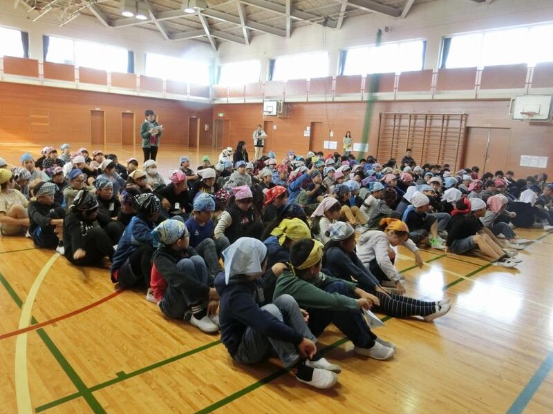 竜巻発生・避難訓練では、子どもたちはみんな真剣に取り組み、避難開始の放送で、初めて実施の1年生も 静かに机の下にもぐり、床にひざと手をついて頭と首を守る姿勢を取ることができました。体育館への避難も、全児童が静かにスムーズに行うことができました。避難の時に話をしたり、ふざけたりしてしまった児童は、一人もいませんでした。
