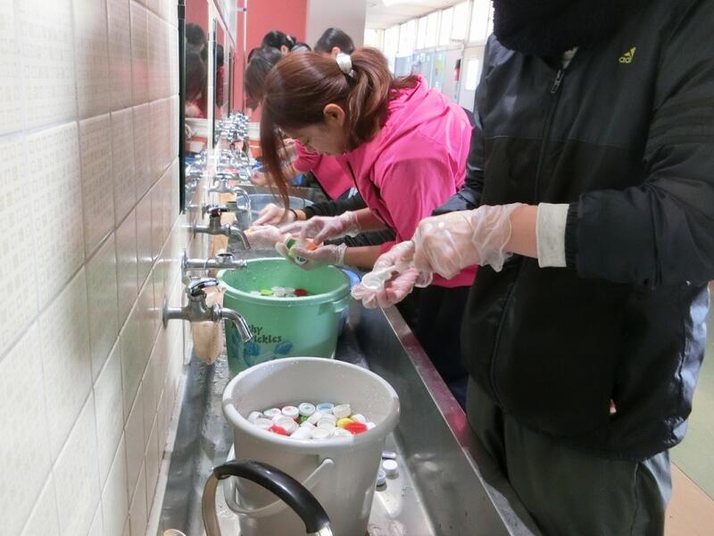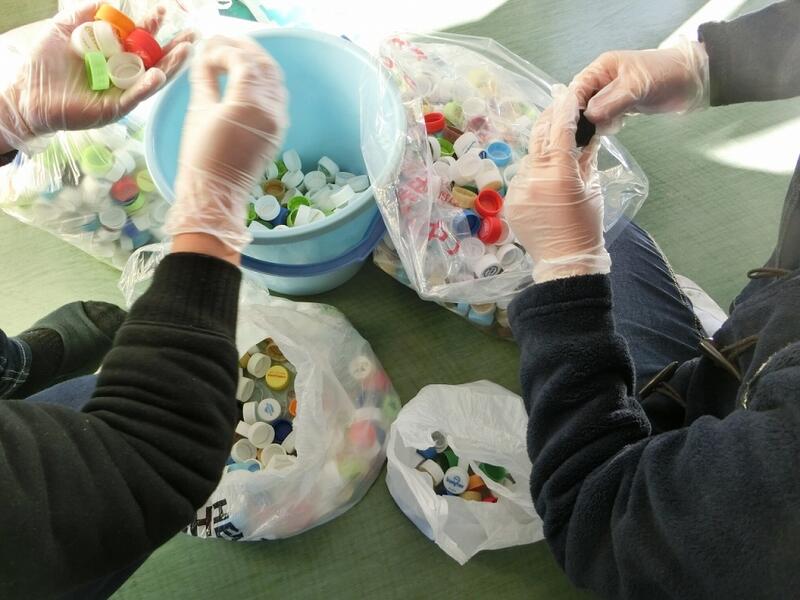 保護者・地域の皆様にご協力いただき回収しているエコキャップがたくさん集まりました。きれいに洗ってあるものは、そのまま業者に引き取っていただけるので、分別します。残念ながら、汚れのあるものは、一つ一つ歯ブラシを使って汚れを落とし、乾かしてから業者に引き取ってもらいます。