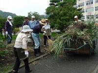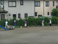 14名の皆様が学校に来てくださり、8時に作業を開始すると、校庭南側フェンス周辺の生垣や樹木、駐車場付近の植え込みの樹木や下草、花壇の草が見る見るうちにきれいになりました。