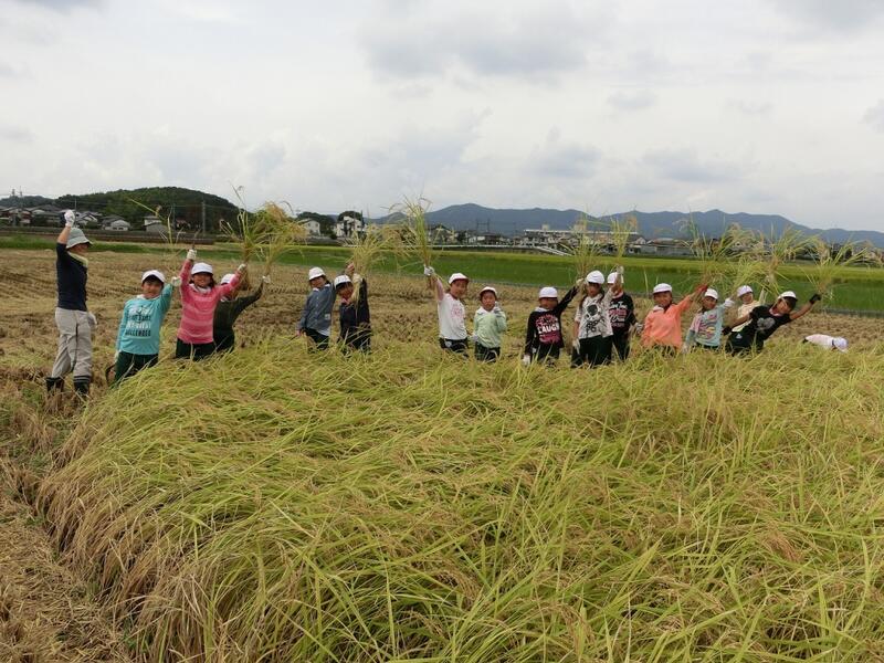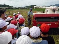 稲刈り作業 ・ 順調 稲刈り楽しい! 脱穀機による作業も見学!