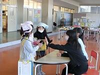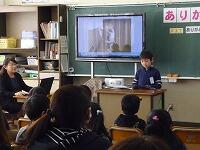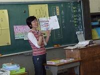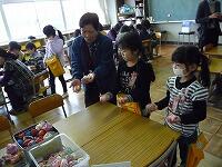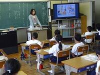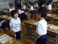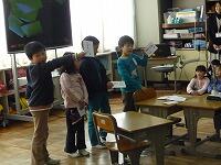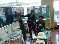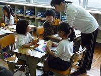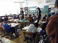 2時間目、1年1組では、道徳の授業「あいさつ」という題材で、礼儀についての学習をしていました。大型テレビをモニターとして利用し、考えるポイントを分かりやすく説明した後、ロールプレーを行いながら、「やさしく、大きな声で、明るく、笑顔で、目を見て・・・」とあいさつのポイントを考えることができました。1年2組は、算数で、時計の見方の勉強をしていました。模型を使って時計の読み方を学習した後は、友だちと問題を出し合いながら、楽しく学習していました。