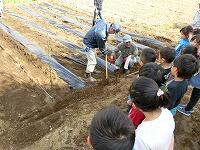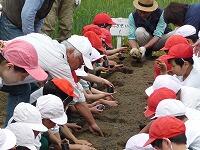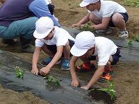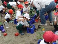 1年生は、さつまいもの苗を植えました。2年生は、えだまめ、トウモロコシ、落花生、さといもの4種類の野菜の苗と種をまきました。また、2年生は、学校に戻り、なす、ミニトマト、ピーマン、オクラの苗を自分の鉢に植え替える作業もしました。 さつまいもやえだまめ、なす、ミニトマトなどの苗に初めてさわった子どもたちも多く、貴重な体験活動を楽しんでいました。