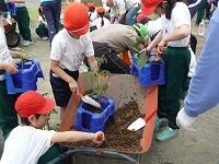 2年生、各自が希望した野菜の苗を、自分の鉢に植える!
