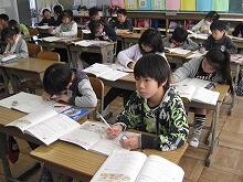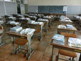 ↑ 人数の多い5年生の教室の様子 どの教室も机の間隔をあけています。