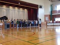 校歌斉唱。6年生のピアノ伴奏に、きれいな声を乗せています。